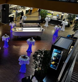 Apéro: entspanntes Ankommen an Stehtischen mit Chips, Nüssen und einem Glas Prosecco, Wein oder Alkoholfreies.
