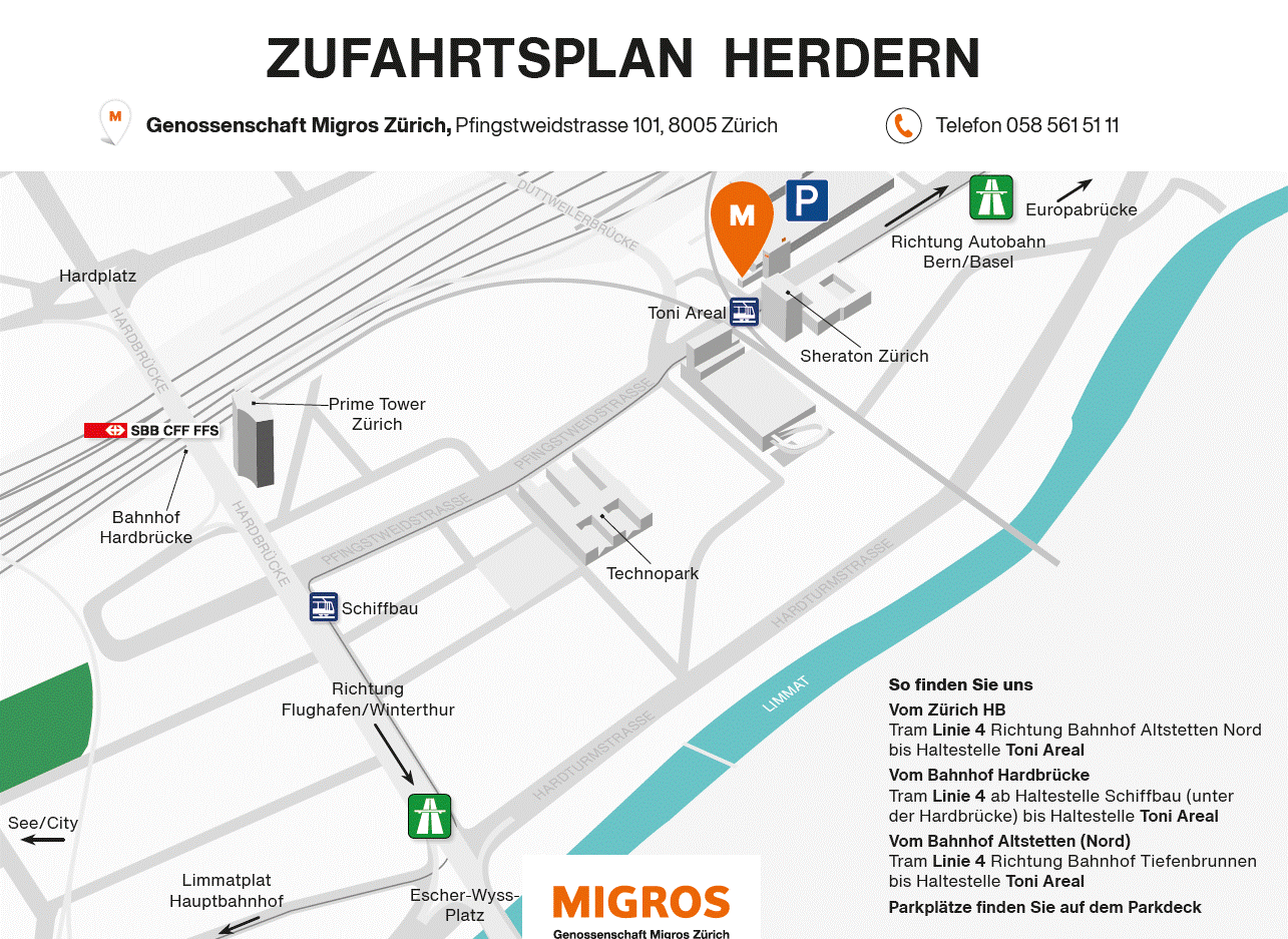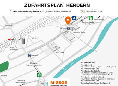 Die Lokalität ist bequem erreichbar – am besten mit dem öffentlichen Verkehr: Tramlinie 4 hält direkt vor der Tür. Wer mit dem Auto kommt, findet Migros-Parkplätze auf der Dachterrasse (gebührenpflichtig). Die Einfahrt am Ende des Gebäudekomplexes von Zürich aus kommend.